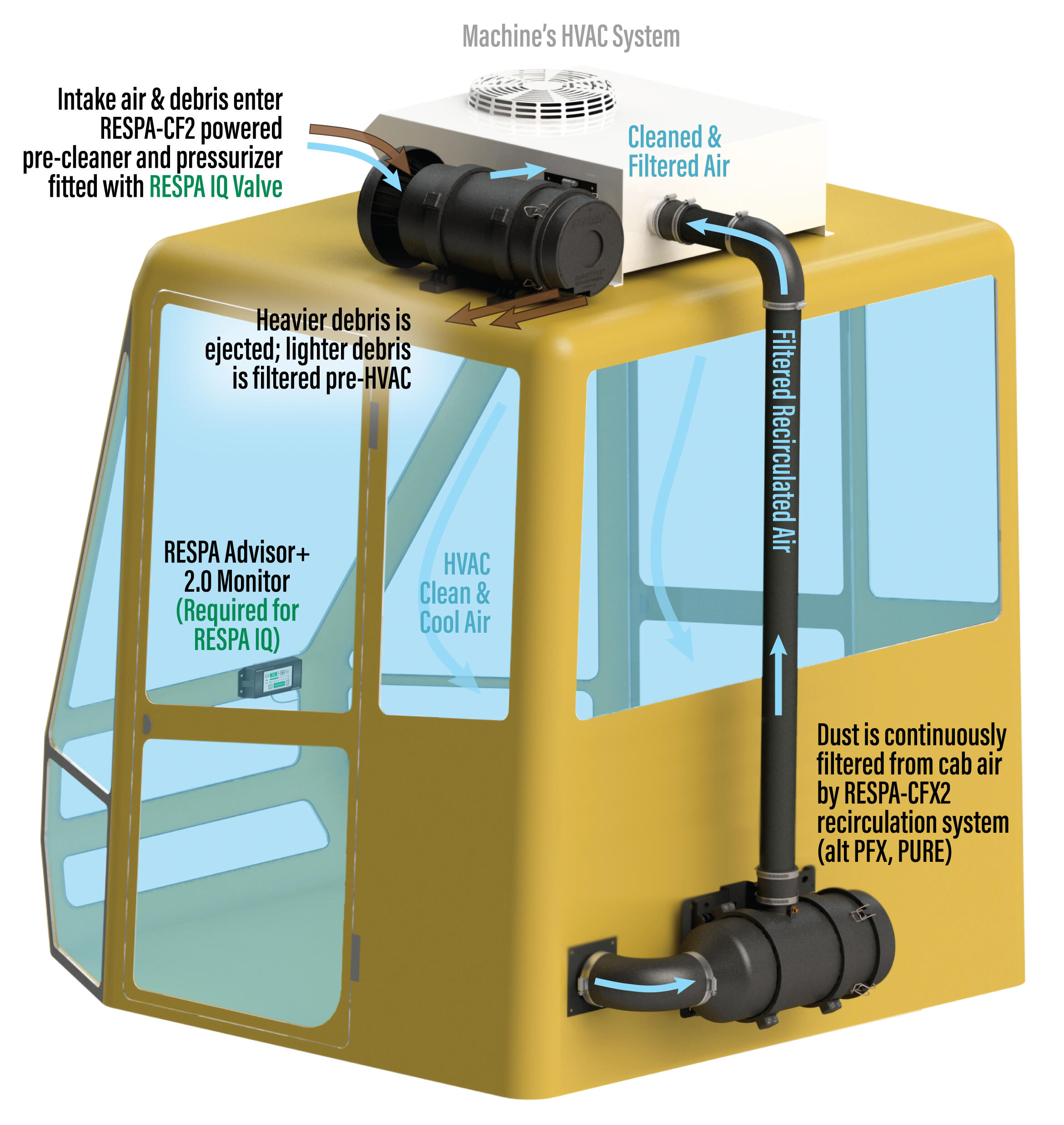 The new RESPA IQ valve is a motorized actuator assembly designed for the RESPA-CF2 powered precleaner and pressurizer unit. RESPA IQ works in conjunction with RESPA Advisor+ 2.0 to constantly monitor and regulate pressure inside the cab. The IQ valve is available pre-built into new RESPA-CF2 units or as an upgrade assembly to existing units. (System requires 4″ outlet housing and RESPA Advisor+ 2.0 monitor for operation.)